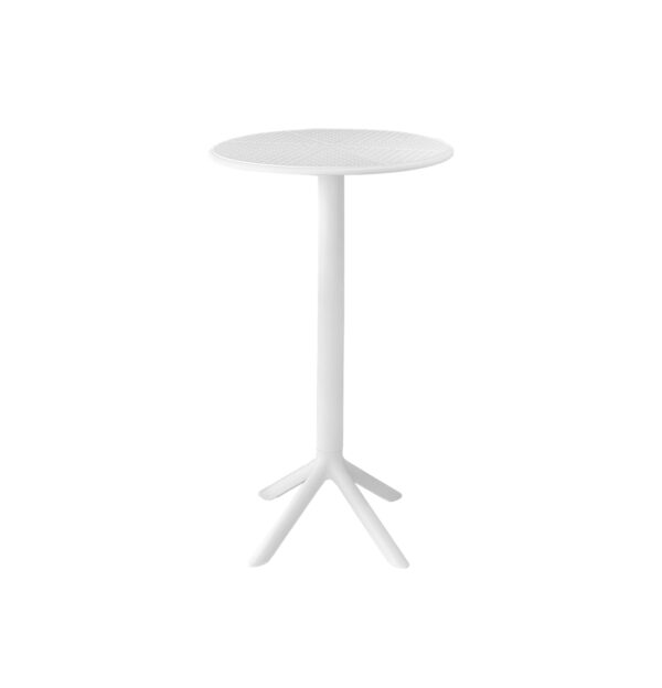 Mesa alta de formato circular con superficie texturizada y estructura central de soporte. Su configuración permite un uso práctico en espacios de atención.