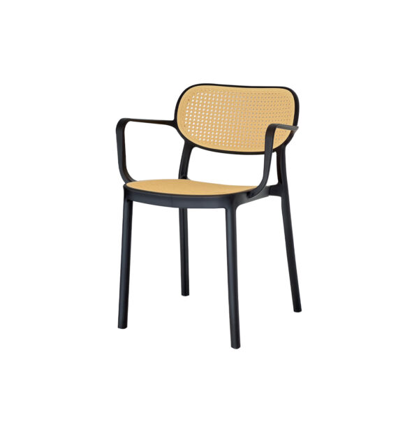 Adriana, es un diseño moderno y ligero, que mezcla un estilo clásico con un toque contemporáneo. Destaca por su estructura en color verde suave y su asiento y respaldo en rejilla, lo que le da un aire fresco, natural y acogedor. Sus brazos integrados aportan comodidad adicional.