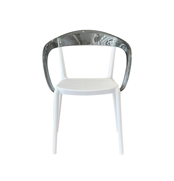 El diseño destaca por su respaldo envolvente y ergonómico que se integra de manera fluida con los reposabrazos, creando una silueta orgánica 🌿. La combinación de una base opaca con un respaldo translúcido genera un juego de contrastes muy moderno, permitiendo que la silla no «recargue» visualmente el espacio, lo cual es ideal para ambientes reducidos.