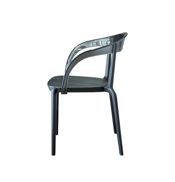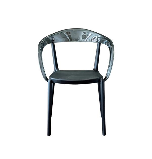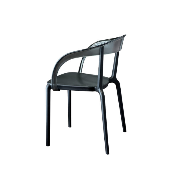 El diseño destaca por su respaldo envolvente y ergonómico que se integra de manera fluida con los reposabrazos, creando una silueta orgánica 🌿. La combinación de una base opaca con un respaldo translúcido genera un juego de contrastes muy moderno, permitiendo que la silla no «recargue» visualmente el espacio, lo cual es ideal para ambientes reducidos.