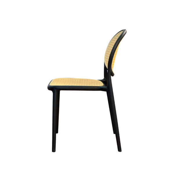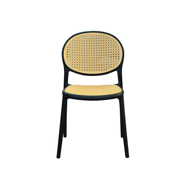 Maoly, es un diseño moderno y ligero, que mezcla un estilo clásico con un toque contemporáneo. Destaca por su estructura en color negro y su asiento y respaldo en rejilla, lo que le da un aire fresco, natural y acogedor.