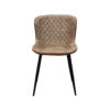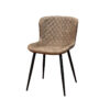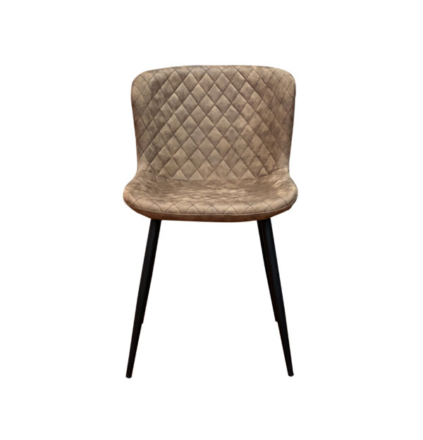 Silla de diseño contemporáneo con respaldo y asiento curvados para mayor ergonomía. El tapizado presenta un patrón acolchado en forma de rombos, aportando textura y elegancia. Sus patas metálicas delgadas, refuerzan la estética moderna y ligera.