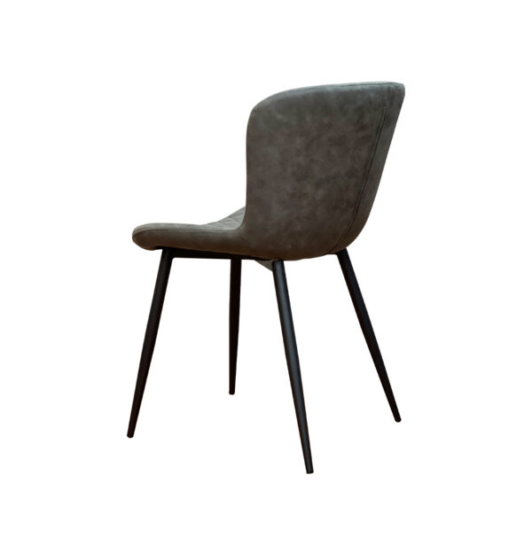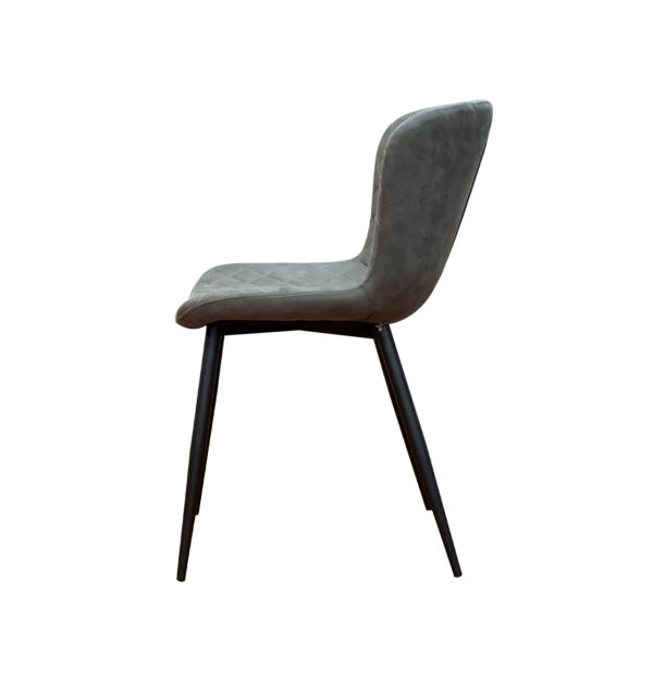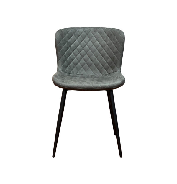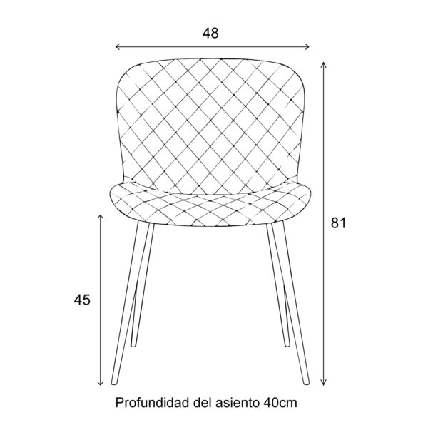 Silla de diseño contemporáneo con respaldo y asiento curvados para mayor ergonomía. El tapizado presenta un patrón acolchado en forma de rombos, aportando textura y elegancia. Sus patas metálicas delgadas, refuerzan la estética moderna y ligera.