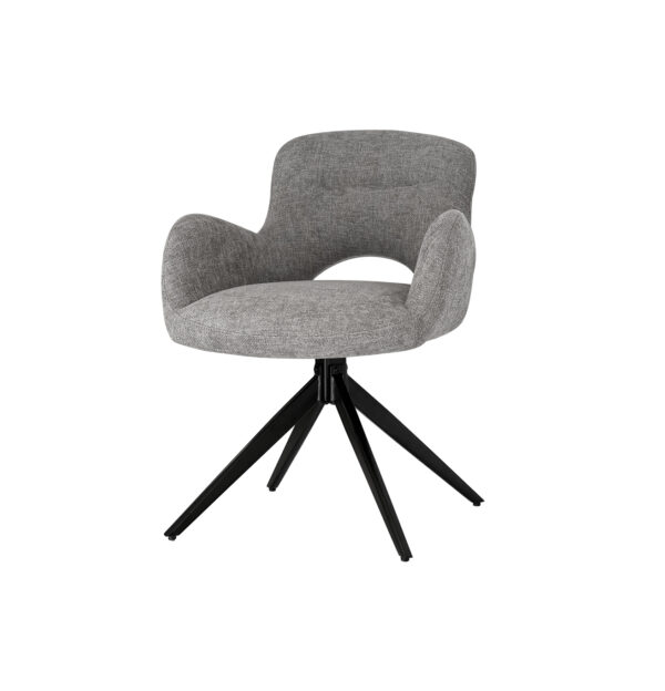 El asiento y respaldo están completamente tapizados en lino texturizado de alta resistencia, un material que aporta frescura, transpirabilidad y durabilidad frente al uso intensivo. El respaldo curvo y envolvente, junto con los apoyabrazos integrados, generan una sensación de soporte continuo.