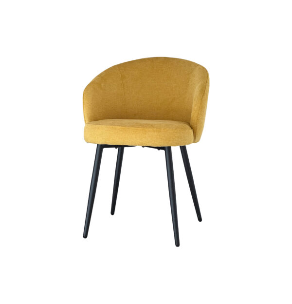 Silla de comedor con respaldo envolvente de trazo continuo que integra apoyabrazos en una sola pieza. El volumen del espaldar se desarrolla en una curvatura uniforme, generando una superficie de contacto amplia y estable.