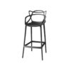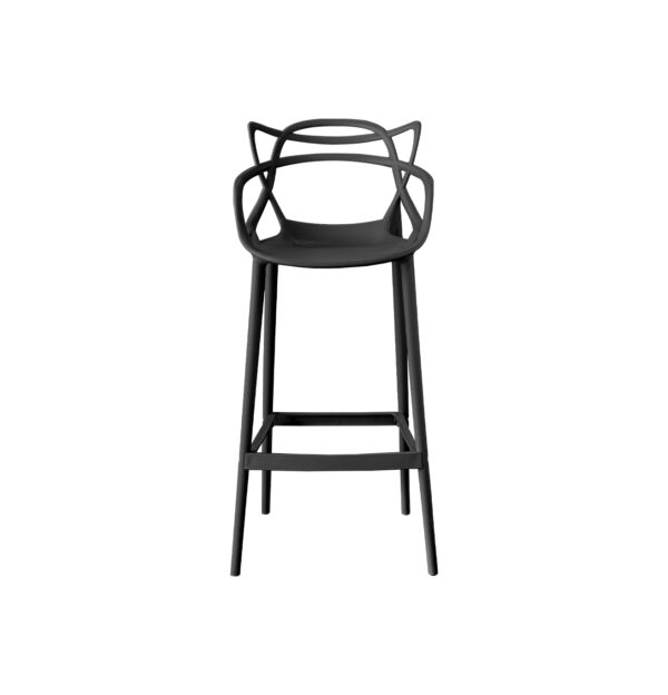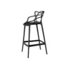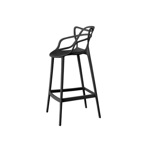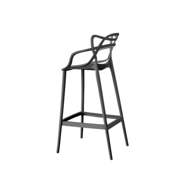 Taburete alto de diseño icónico y vanguardista. Destaca por su respaldo de líneas orgánicas entrelazadas, sirviendo también como apoyabrazos integrados. Es una pieza monobloc que combina una estética sofisticada con gran robustez y comodidad, incluyendo un reposapiés perimetral.