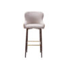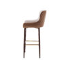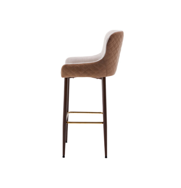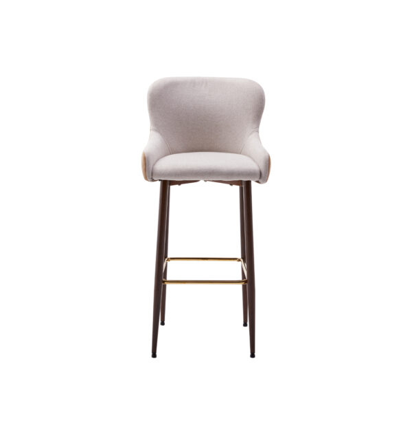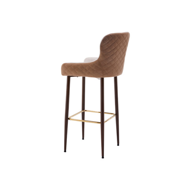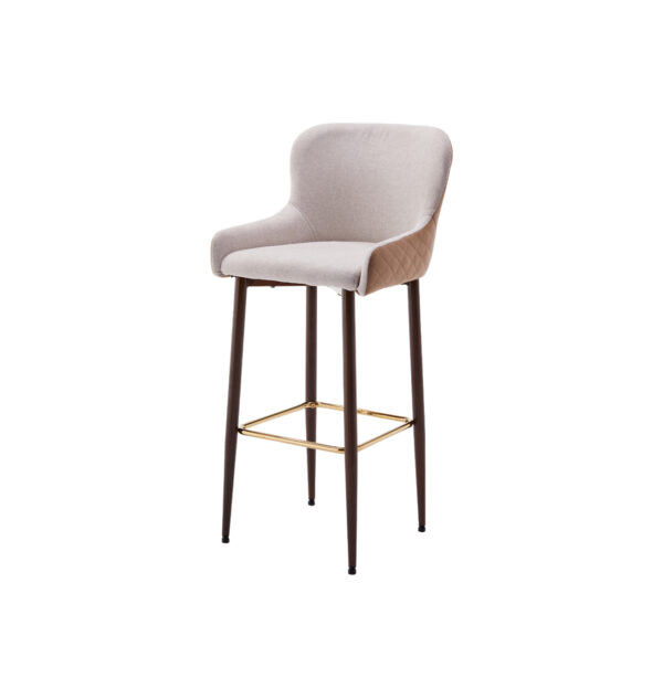 Taburete de diseño contemporáneo con asiento y respaldo tapizados en tono oscuro, líneas limpias y proporciones equilibradas. Su estructura de cuatro patas rectas en madera negra se complementa con un aro reposapiés metálico en acabado dorado, aportando un toque de sofisticación y contraste visual.